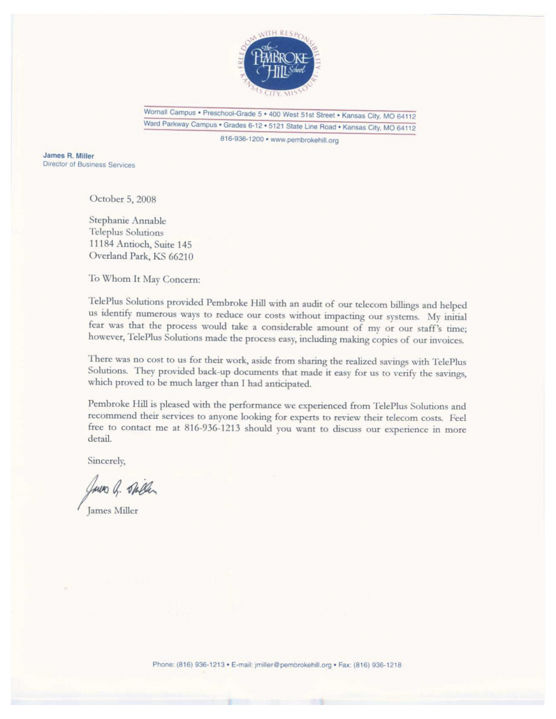 Pembroke Hill is pleased with the performance we experienced from TelePlus Solutions and recommend their services to anyone looking for experts to review their telecom costs. Feel free to contact me should you want to discuss our experiences in more detail.